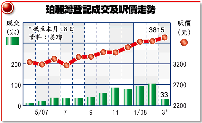 陸耀光指出,珀麗灣造價較青衣明顯落後,所以吸引外區投資者入市,本月的50宗成交,30%買家為投資者,集中購入1及2樓單位,成交價約200萬元,呎價3100至3200元。現時珀麗灣約有1200放盤,叫價170萬至逾1000萬元。