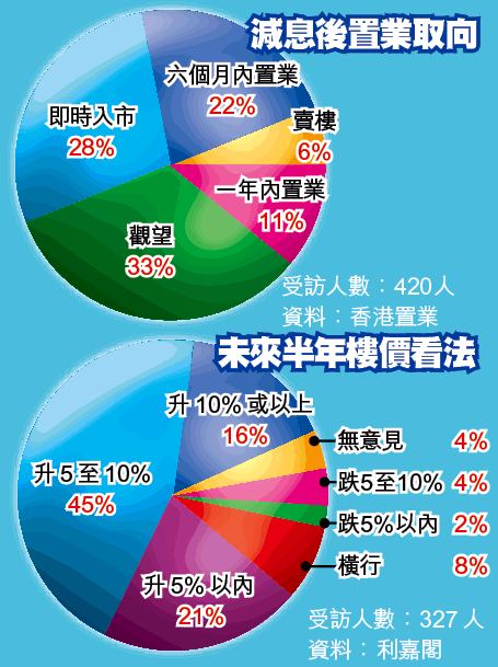 就銀行再減息,香港置業訪問420名客戶,61%受訪者表示,會加快入市決定,28%更計劃即時入市,但亦有三分一受訪者對後市抱觀望態度,另有6%更認為,要趁勢賣樓套現。