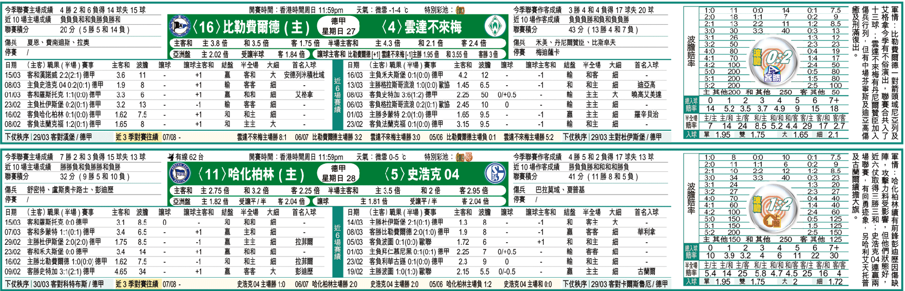哈化今仗續缺於今季德甲入了11球的彭廸歷,今迎實力在自己之上的史浩克,料會踢防守足球。然而,儘管他們後防有費特列治及施蒙歷,不過守力並非想像中強,面對攻力不俗的史浩克,情況並不樂觀。另外,近季他們與史浩克交手成績差,對上4戰成績是1勝3負,宜留意。文:吾中
