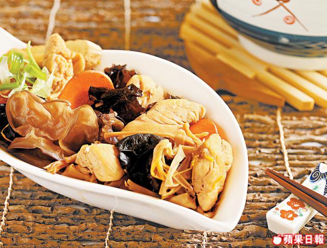 2.起鑊爆香薑片,加入雞件炒香;放入水、蠔油,再加入金針、雲耳燜10分鐘;最後加入甘笋片炒勻即可上碟。