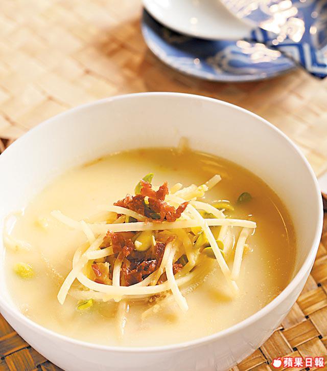 加了金華火腿、柴魚和薑,令只得大豆芽和腐竹的湯,味道相當豐富。腐竹煲溶貌似牛奶般香滑,加上大豆芽,可助鈣質及骨膠原緊貼骨骼,有助骨骼健康。
