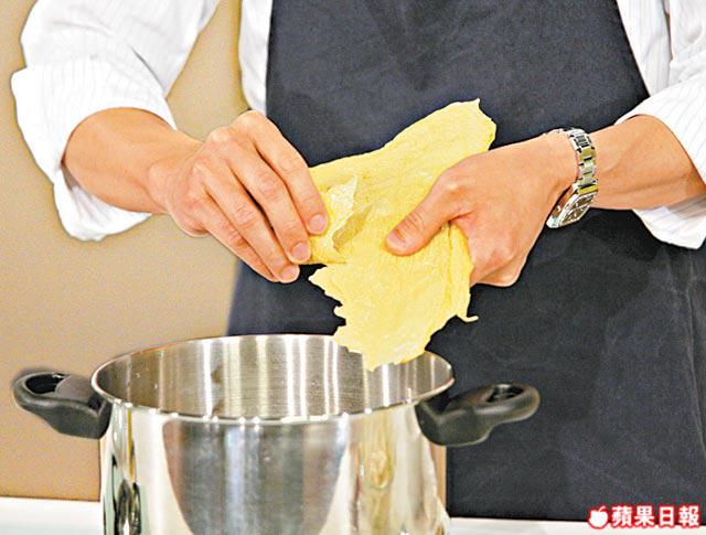 2.開鑊爆香薑片,加入柴魚、水、腐竹滾15分鐘;
