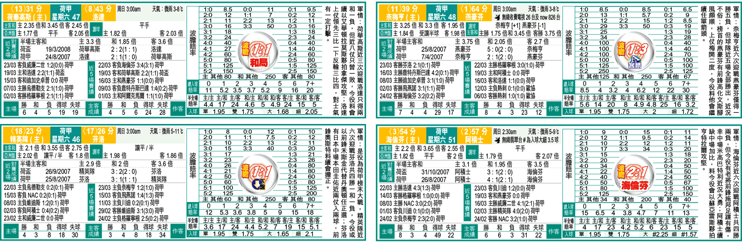 荷甲次席的阿積士到訪第3位的海倫芬,由於阿積士要追燕豪芬機會渺茫,倒不如留力踢下屆歐聯參賽席位附加賽,加上海倫芬近況好,平手有計。(球賽編號:星期六51;無綫翡翠台明日2:30am直播)