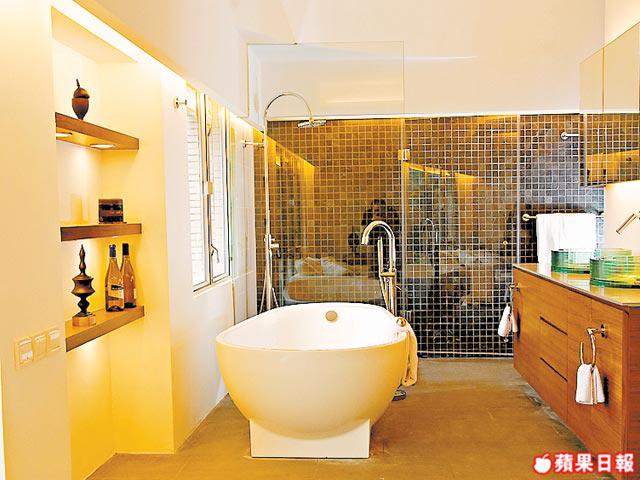 3樓主人房亦同樣以淺灰為主,房中央還放上木製泰式高架床。「床的靈感來自泰式戶外Spa木床,讓人有置身泰國做Spa的輕鬆自在。」床的對面是開放式浴室,令人不論坐在床上、梳化,甚至浴缸內,都可飽覽窗外的海洋公園美景。「浴室與床的地台是刻意升高及分開,加上射燈則令浴室更亁淨整潔。」設計師亦考慮到中國人傳統觀念,把廁所放到最入、最隱蔽地方。