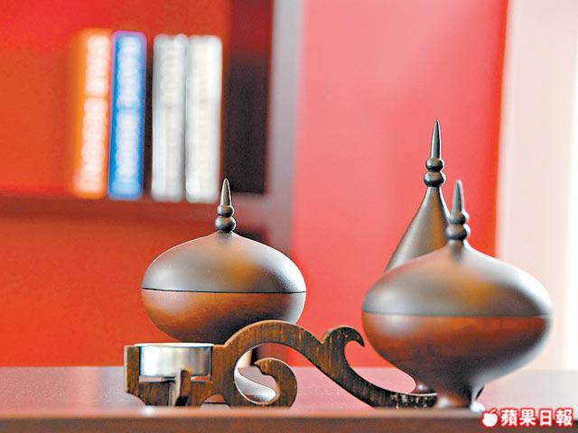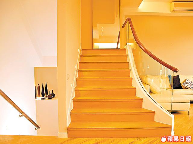 除家具擺設富心思外,1樓廚房的設計亦別出心裁。「煮食是一種樂趣,應該是一邊傾偈一邊煮,所以我用透明玻璃設計半開放式廚房,可加強屋主與客人的互動性和空間感。」全屋的另一賣點是貫穿3層樓的柚木樓梯,樓梯開端以弧形設計。「弧形除令人感覺舒緩外,亦有引領客人的效果,樓梯兩側仿照戲院地下設計,裝上數盞射燈,令整間屋更開揚光猛。」就連簡單的一條樓梯也很講究,從1樓走上2樓的位置,牆身由淺灰變成鮮紅色,以配合2樓偏廳之色。