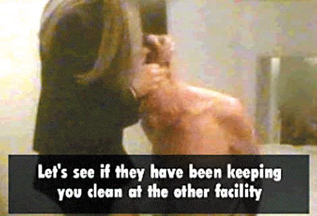 之後莫斯利穿回衣服,輪到他當施虐者,妓女則穿上集中營囚犯黑白間條制服,趴在梳化上,露出光脫脫的屁股,讓莫斯利鞭打。只見莫斯利不停用德語怒吼,說:「你需要更嚴厲的懲罰!」然後狠狠鞭打她們,妓女痛聲大叫,莫斯利鞭得越是興奮。