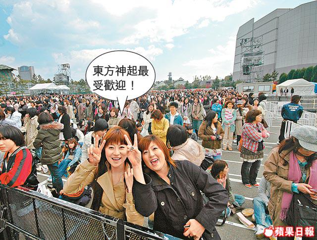 會場地上有編號,以為只是企位沒人跟隨,那太小覷日本人了,他們真是一個跟一個站在腳前的號碼後,一行一行,秩序井然。未夠鐘,有人企有人坐有人準備打扮迎偶像!究竟這隊2004年成立,2005年便攻陷日本的韓國音樂組合有幾勁?