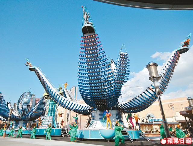 每天4pm的大巡遊都是重頭戲,不少人2:30pm未到便沿路線霸靚位!但今次不用了,因全新表演一日有兩場1:30pm及4pm,我錯過了首場,可惜天公不造美,竟在次場開前下雨,15分鐘前仍說可能取消,真擔心!幸好,突然放晴,果真「神起」!這個全新表演採用固定舞台,由美國設計並在大阪裝置兩朵各重7噸的「花」,中間由一個台連接。兩朵花各高13米,開花前7米闊,開花後20米闊,兩個台共長47米,表演位置在Stage22及E.T.Adventure前空地。兩朵花共有24塊花瓣,內外共6塊,花瓣上合共有2萬7千個可發出不同顏色的LED,是一個會轉動又有影像的舞台,各表演者不停在花瓣內外上上落落,合演一齣長20分鐘的歌舞劇,由日本作曲家寺島民哉和村松崇繼及兩名美國專做電影音樂的TimWilliams和AlanLeeSilva合力創作!