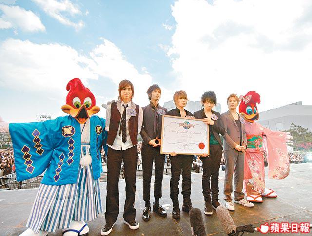 近2pm,任命時刻了!五人Xiah、Micky、Hero、Max和U-know由穿上日本、韓國、香港、台灣及泰國等民族服的Snoopy家族帶領出場!不用說了,我雖站在與Fans隔得遠遠的記者欄裏,尖叫一樣刺耳,只聽到一聲聲「U-know」,他應是最受歡迎!接着由CharlieBrown頒證書、受命、打手印及現場唱兩首歌贈興,明天4月1日起,他們正式做為期一年的親善大使,每逢大時大節,總會在USJ見到他們!