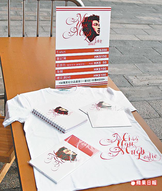 紀念張國榮的「MissYouMuchLeslie繼續寵愛音樂會」,今日起在紅館舉行,現場售賣的紀念品包括5款價值200元的T恤、150元的筆記簿、100元的海報及分別售50元的兩系列明信片,《煙花燙》DVD則售100元,至於全套紀念品優惠價為550元。紀念品的收入扣除開支,將撥捐慈善機構。