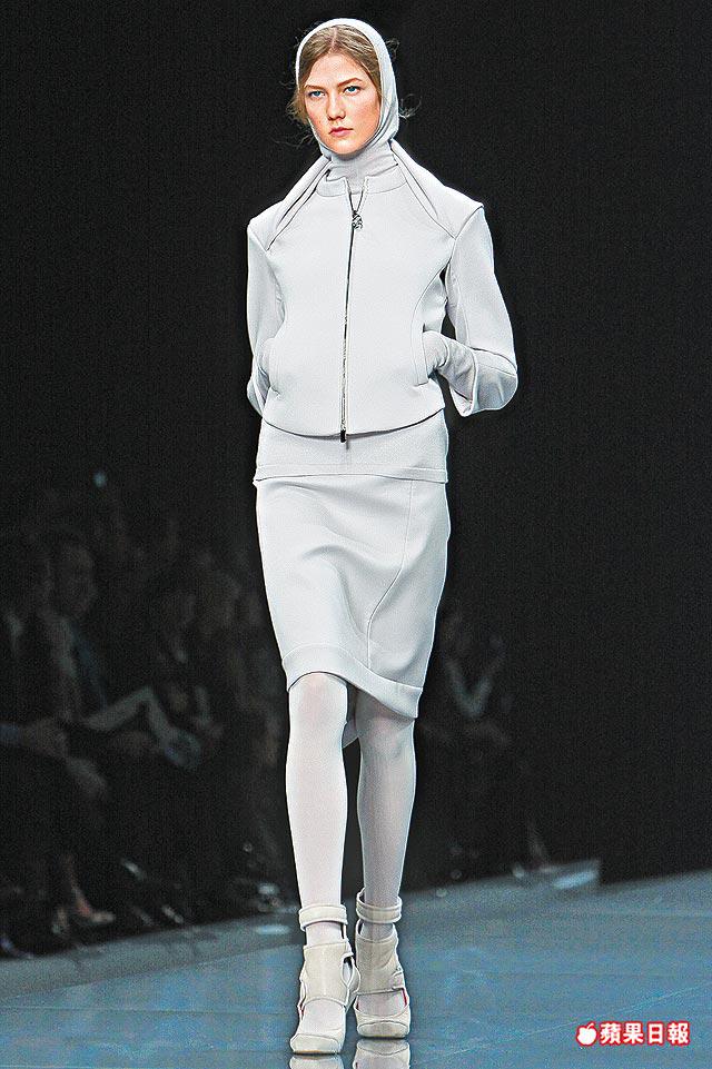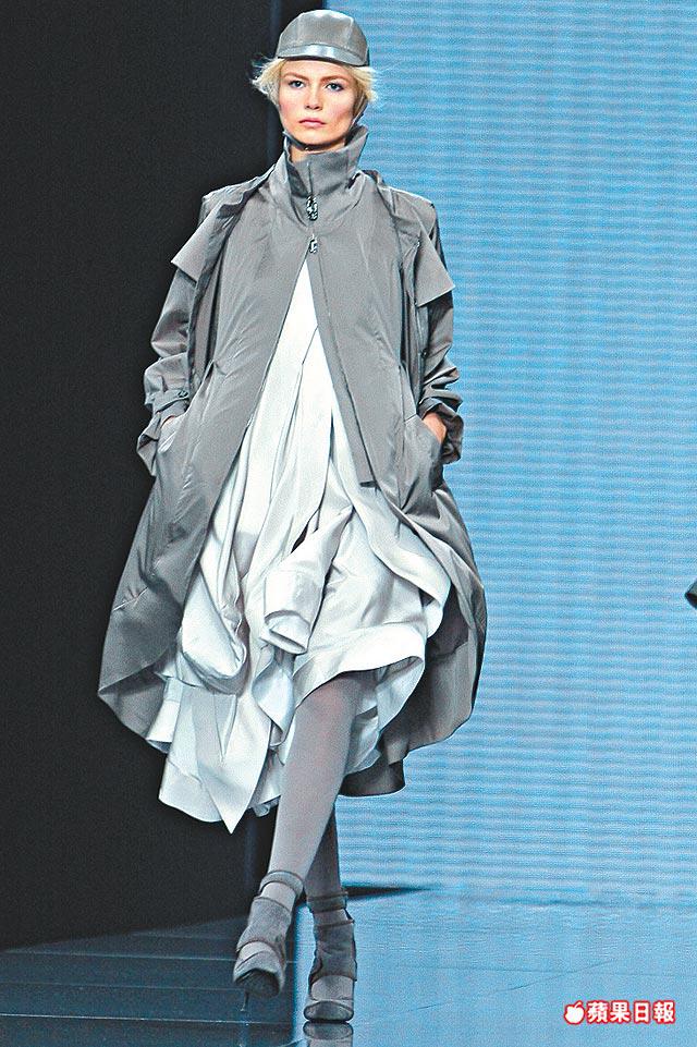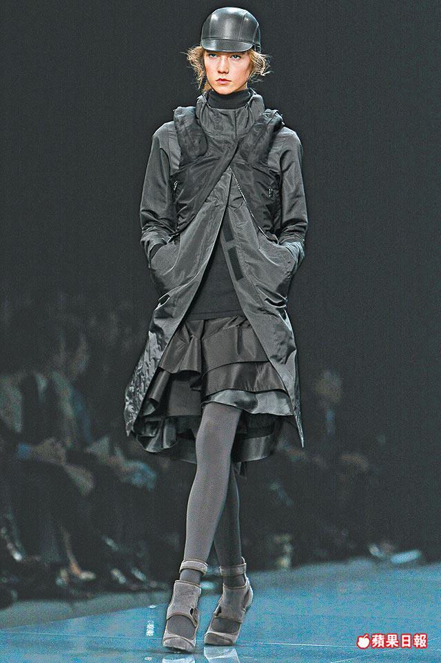 項目包括fur-zonedcoat、chunkyknitdress、foxcape、double-facedcashmerecoat、ruffledboiledwooldress、大量的parka、trench及windbreaker。裙子則有folded、layered及asymmetricalcut作把戲,techno運動情節最顯眼莫過於附有自動黏貼strape的ankleboots、backpack及airpadarmwarmer。