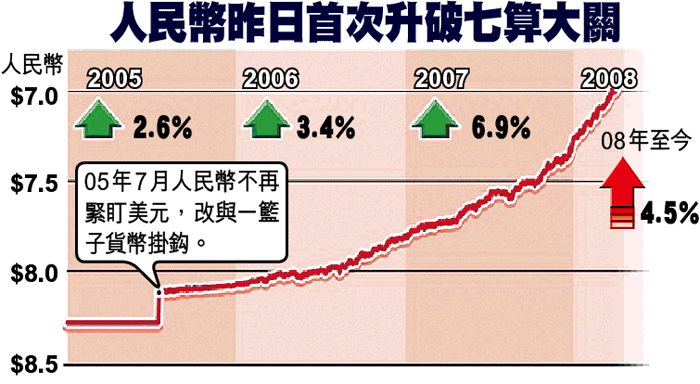 人民幣升值軌迹持續,滙豐銀行環球資本市場交易業務香港區主管陳紹宗指出,過去數月,人民幣平均每月升約1,000點子,破七前夕,本月初升值已放慢,故他預期昨日升越七算後,短期內因美元弱勢推動,人民幣將加快上升,全年計預期人民幣升值8至10%。