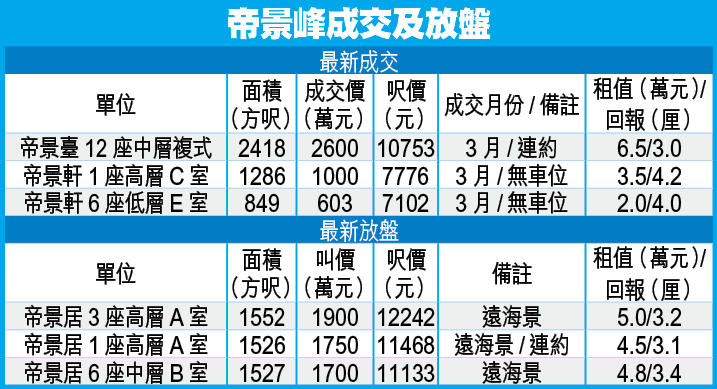 屋苑另一組多層大廈帝景軒,望山及園景,放盤呎價7000至1萬元。至於帝景臺則以複式設計,面積2200方呎以上,盤源矜貴,放盤不足5個,叫價每方呎逾1.1萬元。