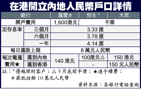 不過,本報致電恒生廣州分行查詢,該行職員表示,優越理財客戶仍可享在港分行代辦開戶服務,數個工作天便可成功開戶,但一般客戶須親身到內地分行辦理。成功開立內地人民幣戶口,每次電滙收費,一般客戶為150元;優越理財客戶收100元,若將內地戶口存款滙回香港,只要在港分行填寫表格轉交內地即可,不設上限及不收費。
