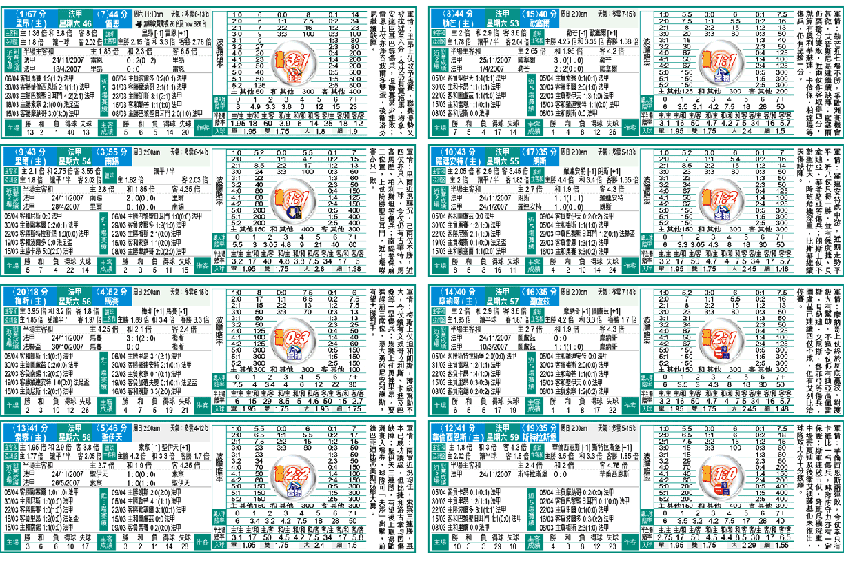 法甲「王者」里昂上周作客大敗予馬賽,今周主場面對雷恩,考慮里昂今季極少連敗,加上首循環作客也淨勝雷恩兩球,主W及「主勝」可放心出擊。(球賽編號:星期六46;無綫收費電視26台及now826台今日11:10pm直播)