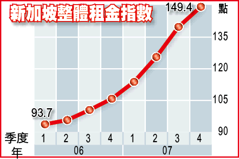 新加坡市區重建局數字顯示,07年住宅租金升41.2%,創下歷來最大升幅,部份市區外圍地區升幅更逾六成。不過,第四季開始回軟,核心中央區升幅更比其他地區遜色,業界料今年市區外圍租金仍可保持20至30%增長,核心中央區則收窄至15至25%。