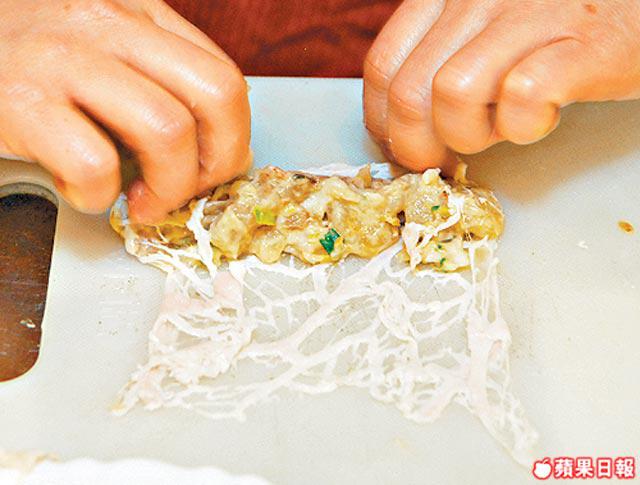 2.豬網油洗淨,剪一小塊,以少許餡料包成長約10厘米的長條。