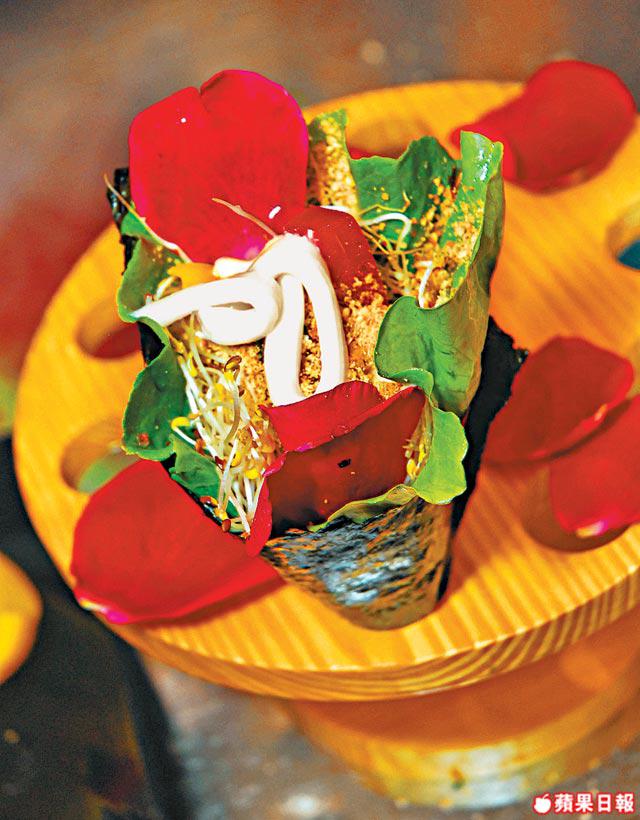3.雙手捧起,外加半塊紫菜,粗面向內,捲成手卷狀,放在手卷架,再在餡料上唧上少許沙律醬,加上1片花瓣便完成。
