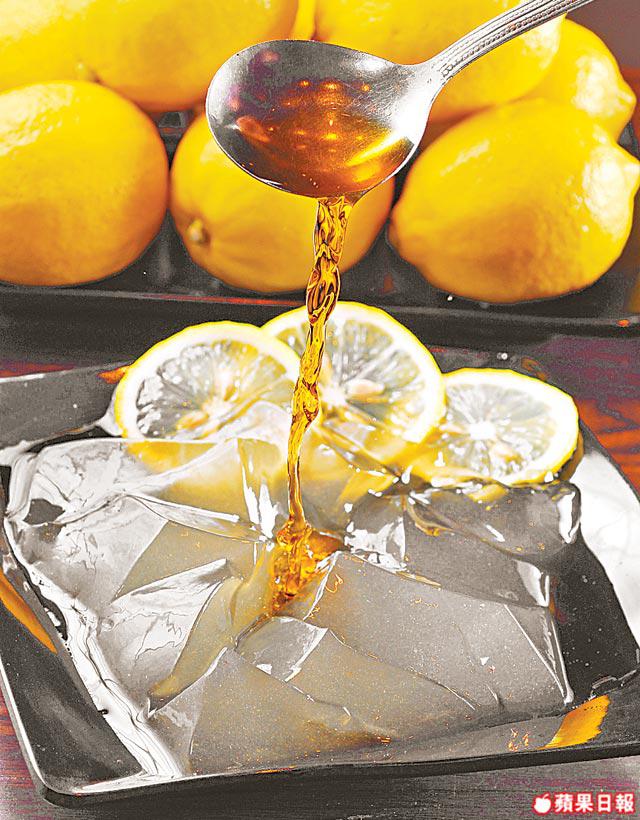 2.等20分鐘,水已凝固成啫喱狀的愛玉凍;切成你想要的形狀,唧上檸檬汁,食時加入適量的片糖水,便成可口甜品。