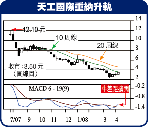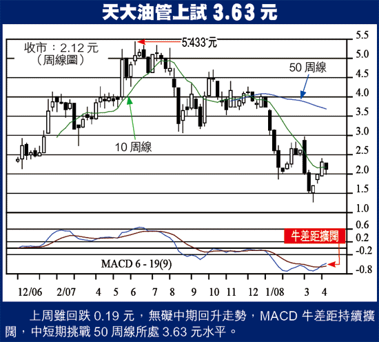(2)今周副選天工國際(826)與首選天大(839)僅一字之差,相同點頗多,都是低PE,中短期看6.36元,浮回水面,升幅81%。