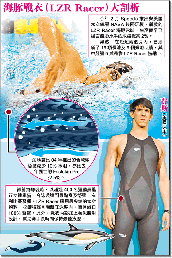 屢破世績固然教人高興,更反映了「海豚戰衣」(LZRRacer)的威力;可惜在佳績背後,究竟是泳手潛能得到真正的發揮,還是泳手靠科技戰勝人類極限?不過國際泳聯上周六已與生產商Speedo會晤,通過這套「新科技禁藥」為合法戰衣!