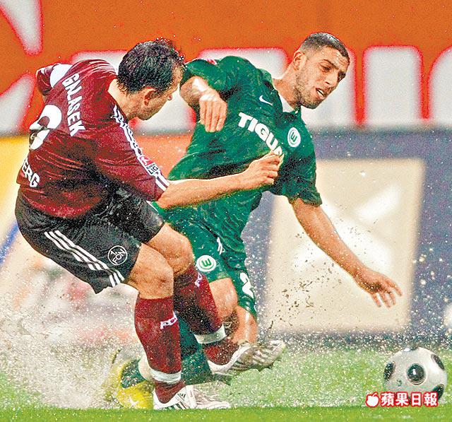 德甲上周五獨腳戲,主場的紐倫堡(左)上半場領先禾夫斯堡一比○,但因場地嚴重積水,球證半場決定腰斬比賽。路透社