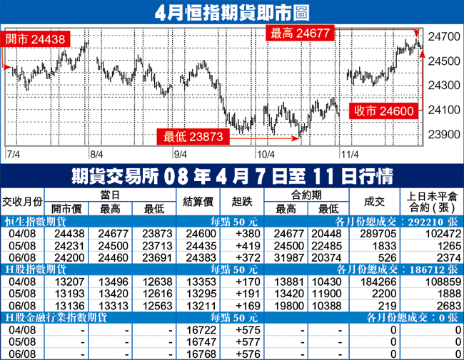 期指上周持續試高位,跌近前周裂口區之上企穩,上周五更強力回升,一度升至24677,以24600高收,全周上升380點,低水67點。