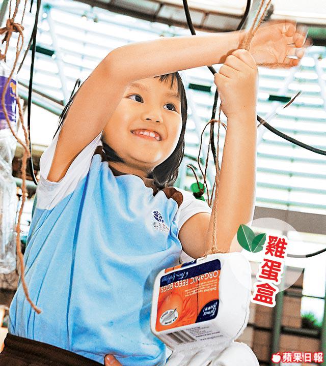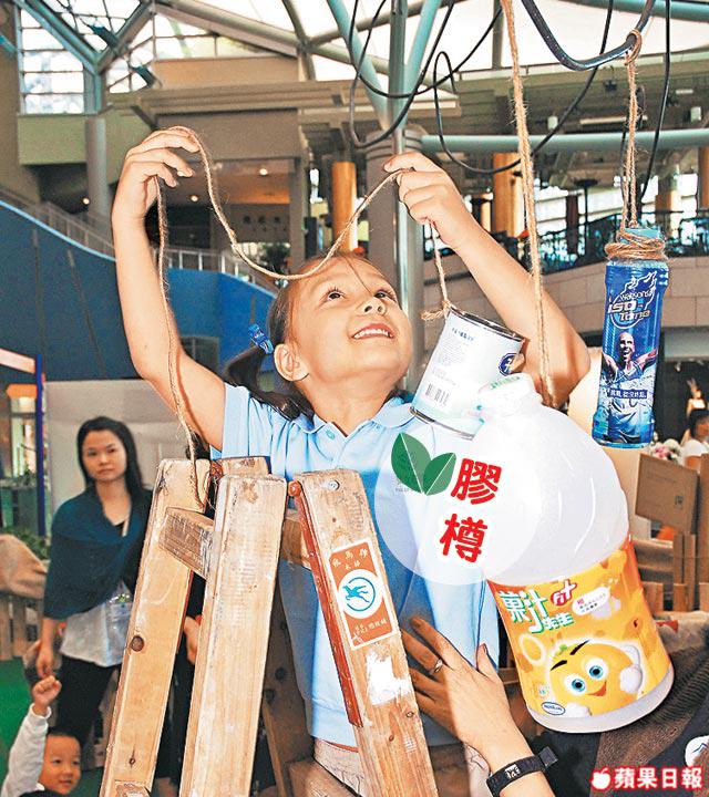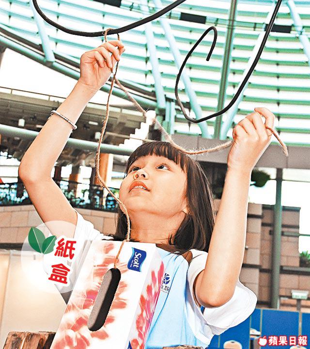 除了玩大迷宮,小朋友還可參加場內的環保工作坊,動動腦筋,廢物利用。今天老師示範的便是把CD變掛飾,其實過程可天馬行空,老師兩三道板斧便把雜誌紙變成花朵!