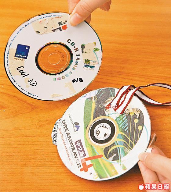 1.用雙面膠紙把絲帶貼在CD上,再把兩片CD貼實,成了掛飾雛形。