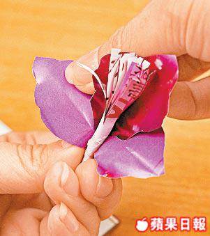 2.用舊雜誌剪出小正方形,剪碎底部,再捲成條狀作花芯。