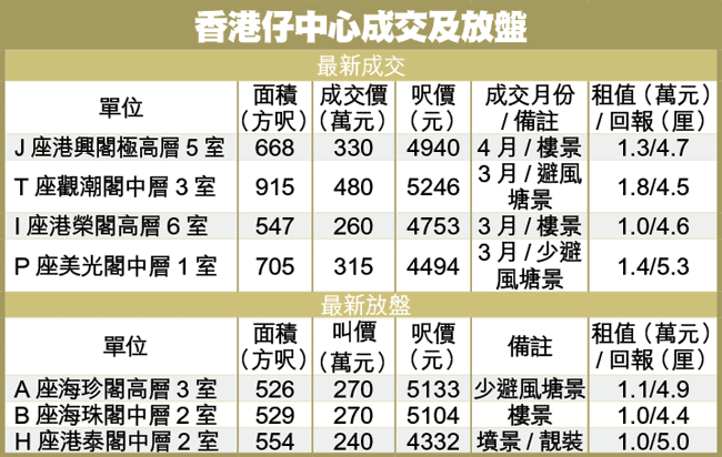 美聯丘松原表示,4月份截至9日,香港仔中心暫錄得一宗成交,3月份則有3宗,大、中、小戶型各一,呎價由約4500至5200餘元。目前放盤約60個,最平墳景戶平均呎價約4300元,樓景單位平均每方呎約4700元,避風塘景單位平均呎價逾5000元。