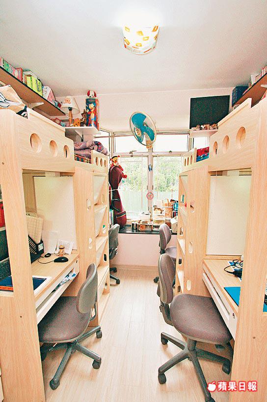 此戶面積542方呎,日字形廳分區清晰,大房由兩個小朋友共用,兩張高架床下方可容納4張書枱,房門旁還有餘位放兩個衣櫃,間隔實用。
