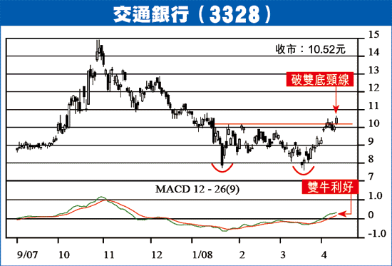 上周五內銀股普遍上揚,其中一隻是交通銀行(3328),由於工行及招行已先後發出首季盈喜,市場相信交行也有很大機會發盈喜,成為推動股份上升動力。