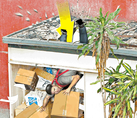 【本報訊】葵涌大連排道一幢工業大廈發生工傷意外,一名搭棚工人在15樓外牆拆除棚架時,懷疑轉換位置解開安全帶,卻失足跣腳墮樓,直墮5樓平台,撞穿一間纖維屋屋頂跌進屋內,被叠高紙箱卸去衝力,得以大難不死,送院搶救後情況嚴重。 記者:梁偉權