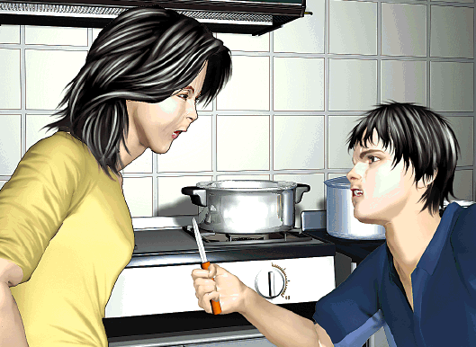 由於聲浪太吵,兄長出來干涉卻遭弟弟反唇相譏:「點解要我扭細聲啊!」此時正在廚房做飯的胡母忍無可忍喝罵:「唔好嘈住阿哥溫書」,豈料胡弟突然走進廚房,取來一柄約4吋長批薯仔的小刀指嚇母親。