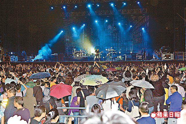 呼風喚雨四個字,絕對符合英國樂隊DuranDuran前晚在西九龍中天地PopTVArena舉行大型戶外露天演唱會時的情況。樂隊開騷不久即引來連場大雨,又刮起刺骨寒風,儘管如此,坐滿全場的fans卻熱情不減,觀眾雖穿雨衣擔遮拿紙皮箱擋雨,但絲毫無損睇騷心情,全晚齊齊跟樂隊揮動雙手,合唱無數經典名曲。