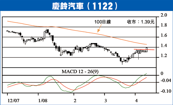 慶鈴汽車(1122)上周五報收1.39元,升4.5%。股價於3月跌至1.06元見底回升,早前升上50日線後橫行整固6天,上周五以大成交炒上,本周料上試位處1.45元的100日線,破位看1.69元,其他汽車股之技術走勢均見好轉,相信汽車股本周可全面向好。現價買入,以1.25元作止蝕位,股價上破1.45元收市,可加一注。