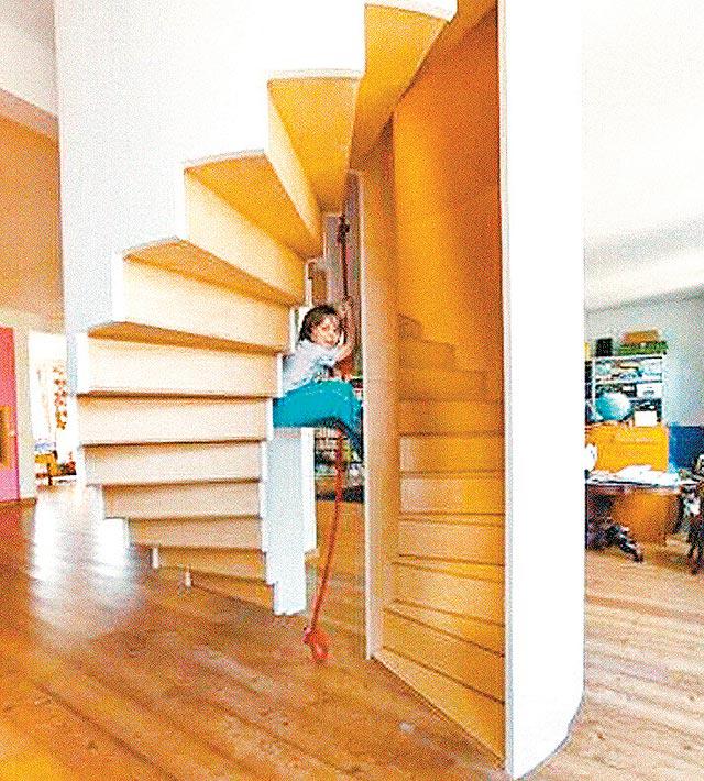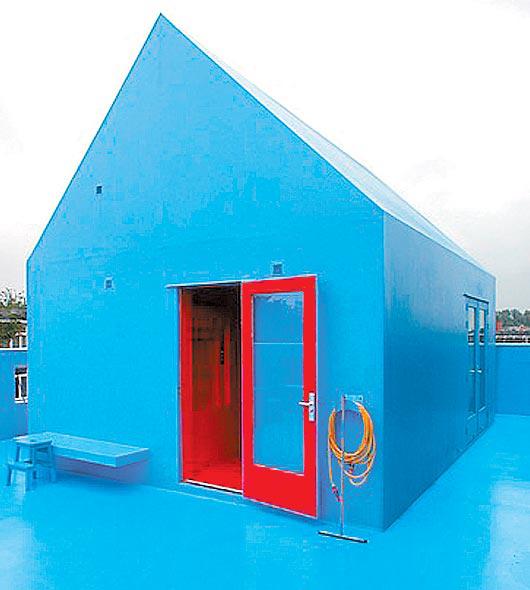 遠看天台屋,外形與附近一排排紅磚屋格格不入,但萬紅叢中一點藍,非常搶眼,就像城巿中的另一個世界。這幾間藍色小屋,其實是以設計出位建築著名的荷蘭建築公司MVRDV的傑作。該公司的創作意念一向天馬行空,今次也不例外,房子外形固然嚇你一跳,室內同樣充滿驚喜,一條凌空的超現實旋轉樓梯直通天台小屋。走出屋外,依然是一片藍,有桌有椅,可邊看風景邊吃午餐。這藍色小屋,奇特,但可愛。