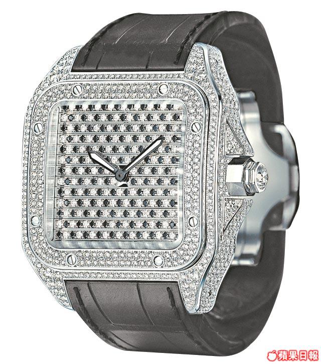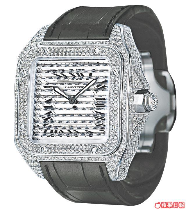 很少人記得Santos是史上第一枚飛行錶,直至這款式慶祝100周年,推出大大隻的Santos100。今年主打男人市場之一,有這枚百葉簾Santos100,在轉動錶冠時,會同時啓動內置的18K白金菱鏡,呈現出三種圖案,包括有羅馬數字刻度、鑽石及黑色藍寶石組成的棋盤圖案,及虎紋圖案。機芯方面搭載的是卡地亞自製手動上鏈鏤空機芯,配備72小時動力儲存。(鑽石共重7.36卡,限量20枚,約售160萬港元)