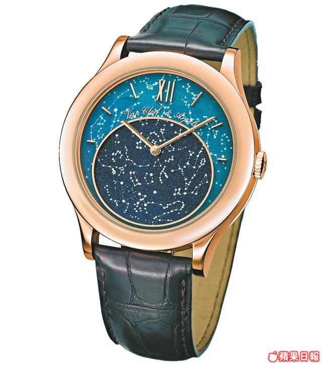 VCA今年亦來一記重拳,主打男士市場,MidnightinParis錶面上是以砂金製成的旋轉式錶盤,手繪上金色巴黎夜空圖,夜空會隨時間轉動。翻開底蓋,可以特製扭掣找尋你想要的日期──例如2月14日情人節的巴黎夜空是怎樣的呢?你可以隨時翻查一下,很浪漫吧!而如果你想訂製一個香港夜空版,也可以找VCA傾傾。腕錶42mm直徑,備用時間40小時。18K玫瑰金及18K白金供選擇。