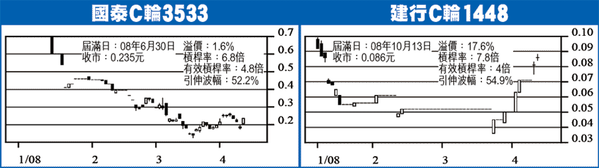 ■國泰C輪3533收0.235元,升0.047元,成交2.1球。此輪08年6月30日到期,行使價13.88元,溢價1.6%,槓桿率6.8倍,有效4.8倍,引伸波幅52.2%,街貨4.8%。此輪短期價內溢價低,正股見17.96元,理論價0.401元,升70%。