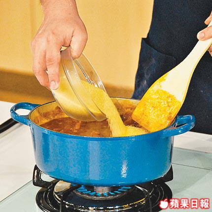 3.以慢火煲1小時或放在140℃焗爐焗1小時亦可。放進番茄和小米飯後攪勻,慢火煲10分鐘。切碎意大利芫荽混入羊肉煲中進食。