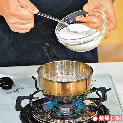 3.小鍋子加熱下水100毫升,分數次下砂糖,每次中火煮至溶化才再下另一份砂糖,其間要不斷攪拌,小心煮成漿狀及漸變深色。