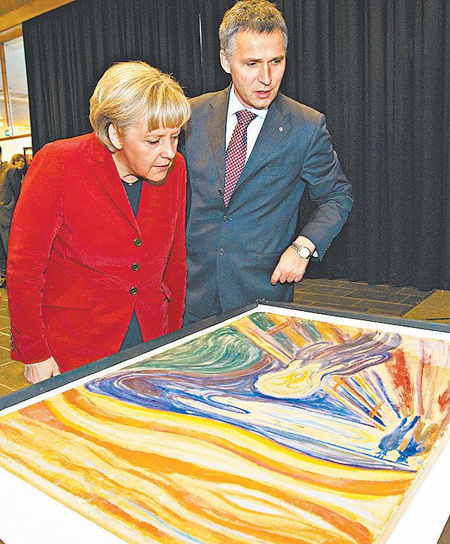肉光四射,默克爾魅力沒法擋,成為眾人焦點,盡搶主人家挪威國皇和皇后的風頭。坐在她身邊的挪威總理斯托爾滕貝格(JensStoltenberg),一直正襟危坐,與她保持眼神接觸,但沒有往下看,保持應有的外交禮節。