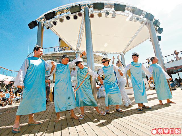 有人說怕坐郵輪,不是怕暈浪,而是覺得日日困在同一地方會悶得發慌,我卻不以為然,這種最源遠流長的旅行方法,一生至少經歷一次才無憾!現在,郵輪服務不斷進步,更多年輕人愛上船,因不只甲板上可找到歡樂,傳統大型表演當然不容錯過,如CruiseDirectorNiam說,現在是南美冬季,他們開始往地中海過夏天,所以船上節目會南美化,即是跳完玩,玩完再跳,好像11pm的DiscoNight便讓人瘋狂!也不知多少年未踏足過香港「的士高」了,但眼下這群來自歐洲及巴西的Teenagers跳到流汗跳到脫衣,手腳也不期然動起來,難得看到不少中老年人也跳得起勁,競舞之心再度熾熱,跳,跳,跳,越夜越多人,忽然記起今夜有個BestCouple選舉,剛到場就見兩個意大利及英國老婆不停在老公大腿上上下下,鬥快吹脹手上的蕉形氣球,玩的投入,看的亂叫,未滿18歲的也一看無妨……還有,今夜好像特別熱鬧,竟多了個Single'sNight,11pm開始,我11:15pm到場想一看有何意大利俊男在等我時,才知:「取消了」!