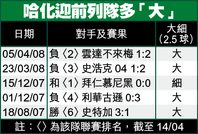 還要留意,儘管哈化近6季於聯賽迎戰漢堡,取得5勝1和,可是今季聯賽於主場對前列球隊,表現頗為差勁,5戰錄得1勝1和3負,且幾乎場場開入球「大」(見附表)。