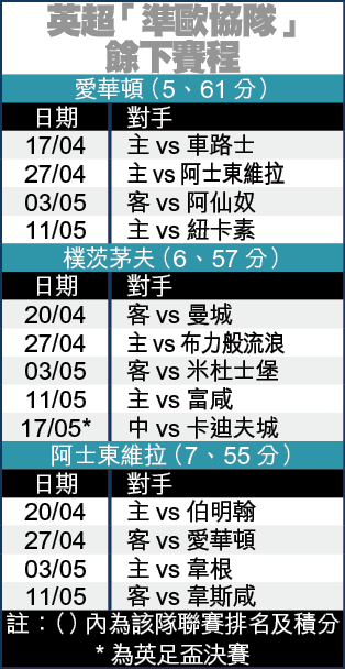 現落後愛華頓6分的維拉,則是3隊中機會最微的一隊,除作客愛華頓難踢外,亦要與伯明翰及韋根等急於搶分的護級分子交手。文:畢傑