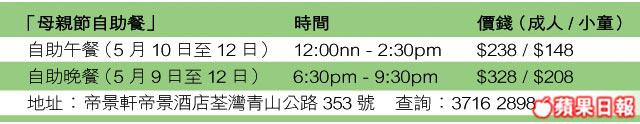 下個月就到母親節,不少餐廳酒店都有着數畀阿媽,就好似帶阿媽去帝景酒店帝景軒嘆自助餐,就會即刻送上美容精美禮品及寶麗來即影即有相一張,等我哋影張全家福留念。此外凡惠顧午餐或晚餐均送上椰汁燉官燕,人人有份,而晚市更額外請你食一客芝士焗龍蝦㖭!唔想坐喺度齋食,可以預早訂位,免費參加埋「親親媽媽烹飪班」,酒店大廚會親自教你包餃子孝敬阿媽,名額有限先到先得。