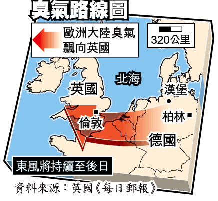 英國南部市民前天(周五)一覺醒來,嗅到一陣非常難聞的惡臭味,不少人最初以為爆屎渠,但臭味非常廣泛,遍及英格蘭南部和威爾斯地區,連英女皇的溫莎堡也無法倖免,要關掉所有窗戶。傳媒指,惡臭味是從歐洲大陸吹過來,相信源頭是來自德國。