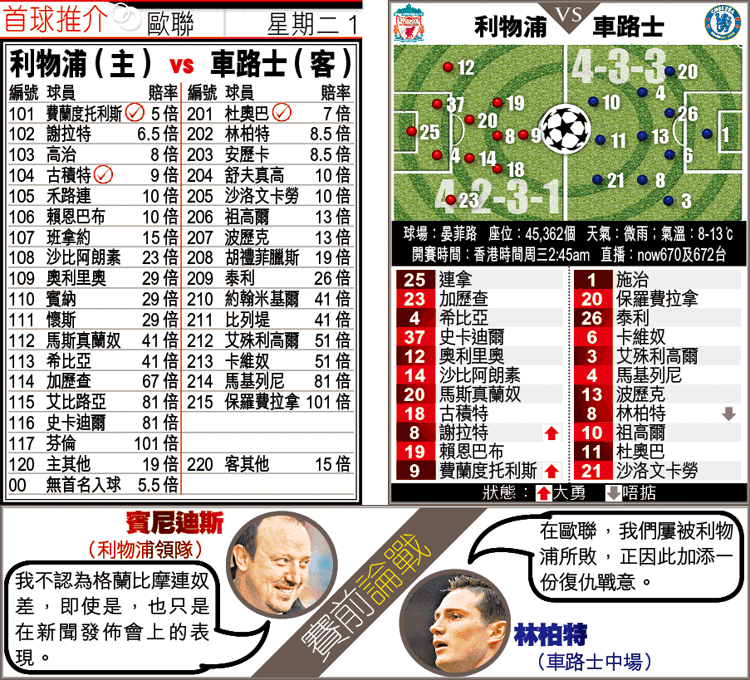 信利物浦在這場4強首回合可挫車路士,理據是紅軍踢歐聯特醒、剋死對手,而「車仔」缺艾辛影響甚大。紅軍主場讓平/半捧上盤,並信費蘭度托利斯一腳定江山。(球賽編號:星期二1;now670及672台明日2:45am直播)